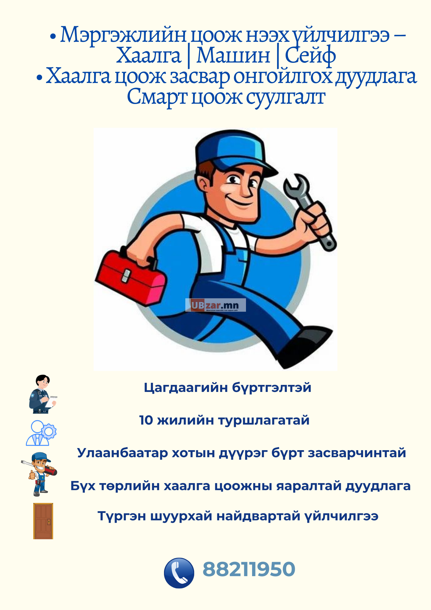 - Гадна болон дотор хаалганы цоож онгойлгох (түлхүүр эвдрэх, мартах, механик гэмтэл)
